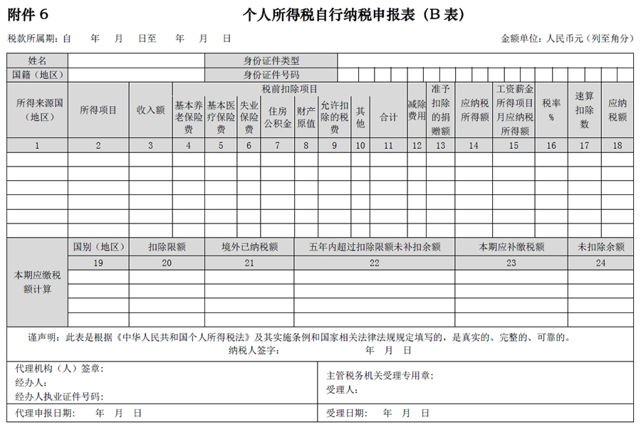 本表适用于“从中国境外取得所得”的纳税人的纳税申报。纳税人在办理申报时,须同时附报附件2—《个人所得税基础信息表(B表)》。