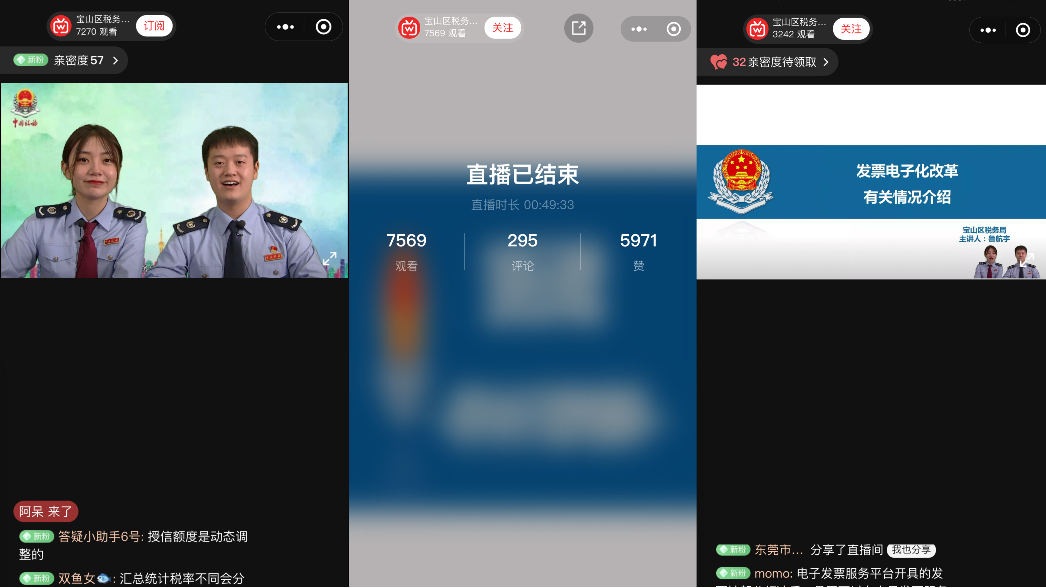 延伸服务,拓展直播影响。此次直播时长约50分钟,吸引7562人次在线观看,收到互动评论近300条。针对无法实时观看直播的纳税人,试点专班还提供了直播回放功能,便于试点纳税人后期观看、学习。“税务部门这次在线答疑直播,实惠实用又接地气,真是太方便了,足不出户就能学习最新业务,让我们对数字化电子发票有了更全面的认识,真是一场及时雨!”上海宝达通电气自动化有限公司的财务孙女士称赞道。