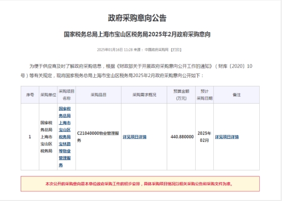 名称: 国家税务总局上海市宝山区税务局2025年2月政府采购意向