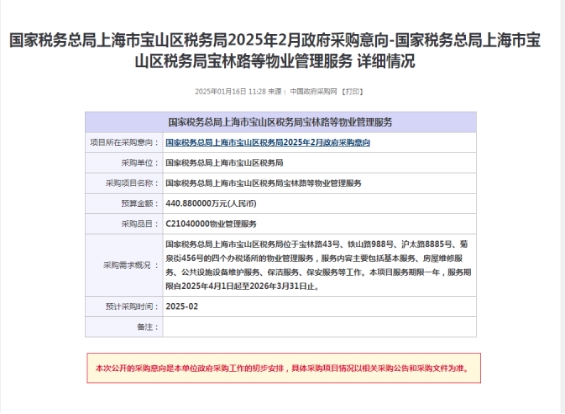 国家税务总局上海市宝山区税务局2025年2月政府采购意向