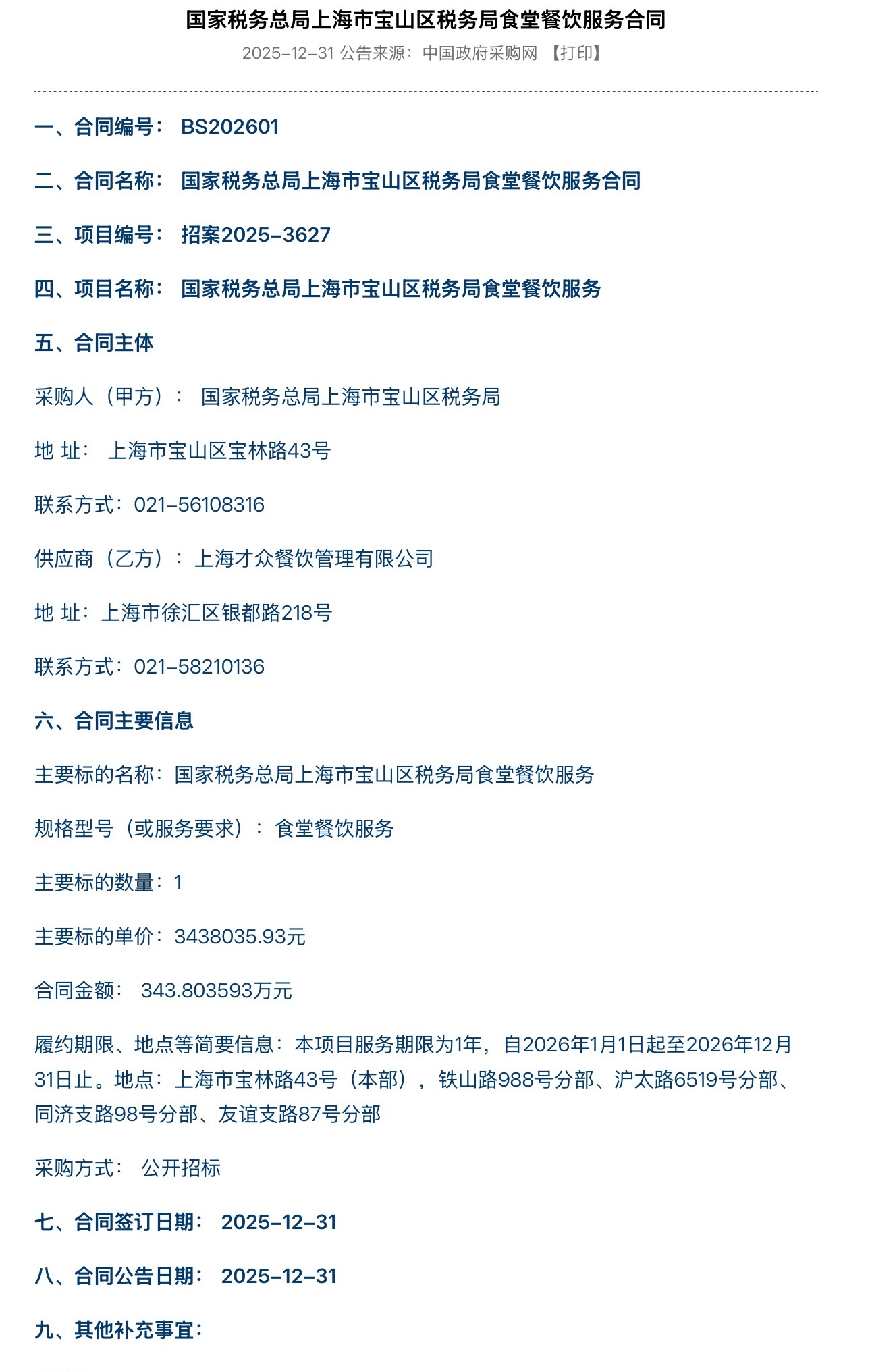 名称: 国家税务总局上海市宝山区税务局食堂餐饮服务合同