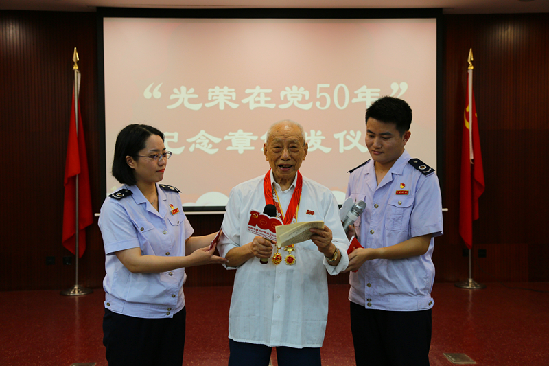 与会领导分别为获得“光荣在党50年”纪念章及获得区局“两优一先”荣誉称号的同志颁奖。离退休党员代表现场满怀深情地感谢党组织的关怀,分享了他在党旗下成长的经历,展现了一个共产党员的责任与担当,让在场每个人都深受触动。