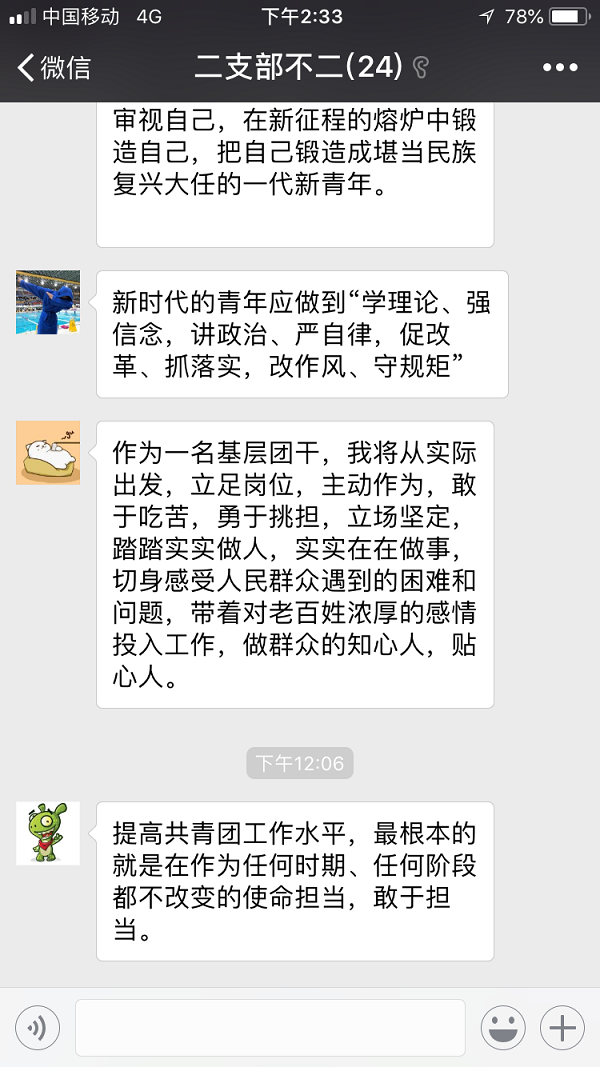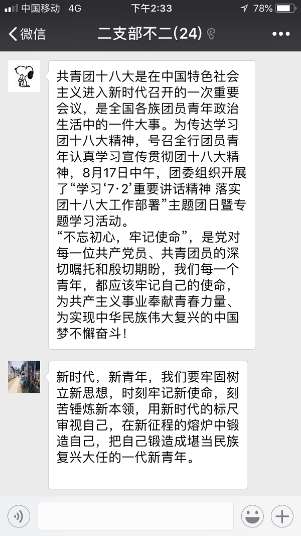 线上“微团课”为变通,充分利用“互联网+”,在午休和下班时间,采用共青团中央网上主题团课、微信群、QQ群等方式开展线上微团课,以克服上班时间紧张,无法集中学习等问题,真正把团的十八大精神送到青年指尖。