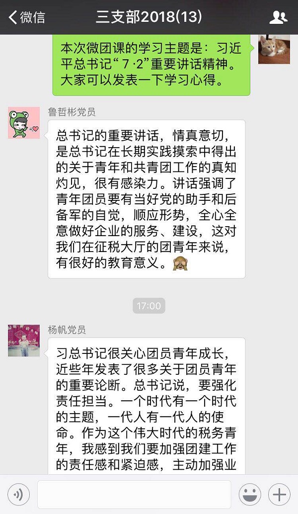撰写学习感悟为展示,学习结束后,及时组织团员青年撰写心得体会、分享学习感悟,鼓励大家把学习内容转化为自己的所思所想,既要深刻领会讲话和会议精神,更要以昂扬姿态和饱满热情投身税务工作实践。