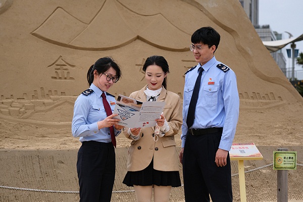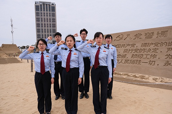 税务干部们来到金山城市沙滩,在党史学习主题沙雕展前重温入党誓词、追忆革命精神,坚定为人民服务的初心。同时,为前来参观学习的游客们发放税宣材料,解答政策。这场与纳税人零距离的宣传活动获得了游客们的好评。