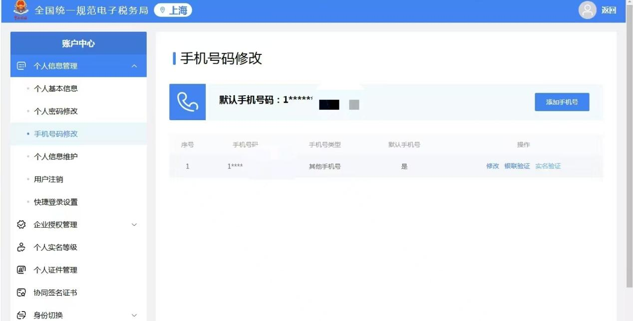 [账户中心]-[个人信息管理]-[手机号码修改]模块,点击该手机号右侧的[银联验证]或[实名验证]按钮进行验证。