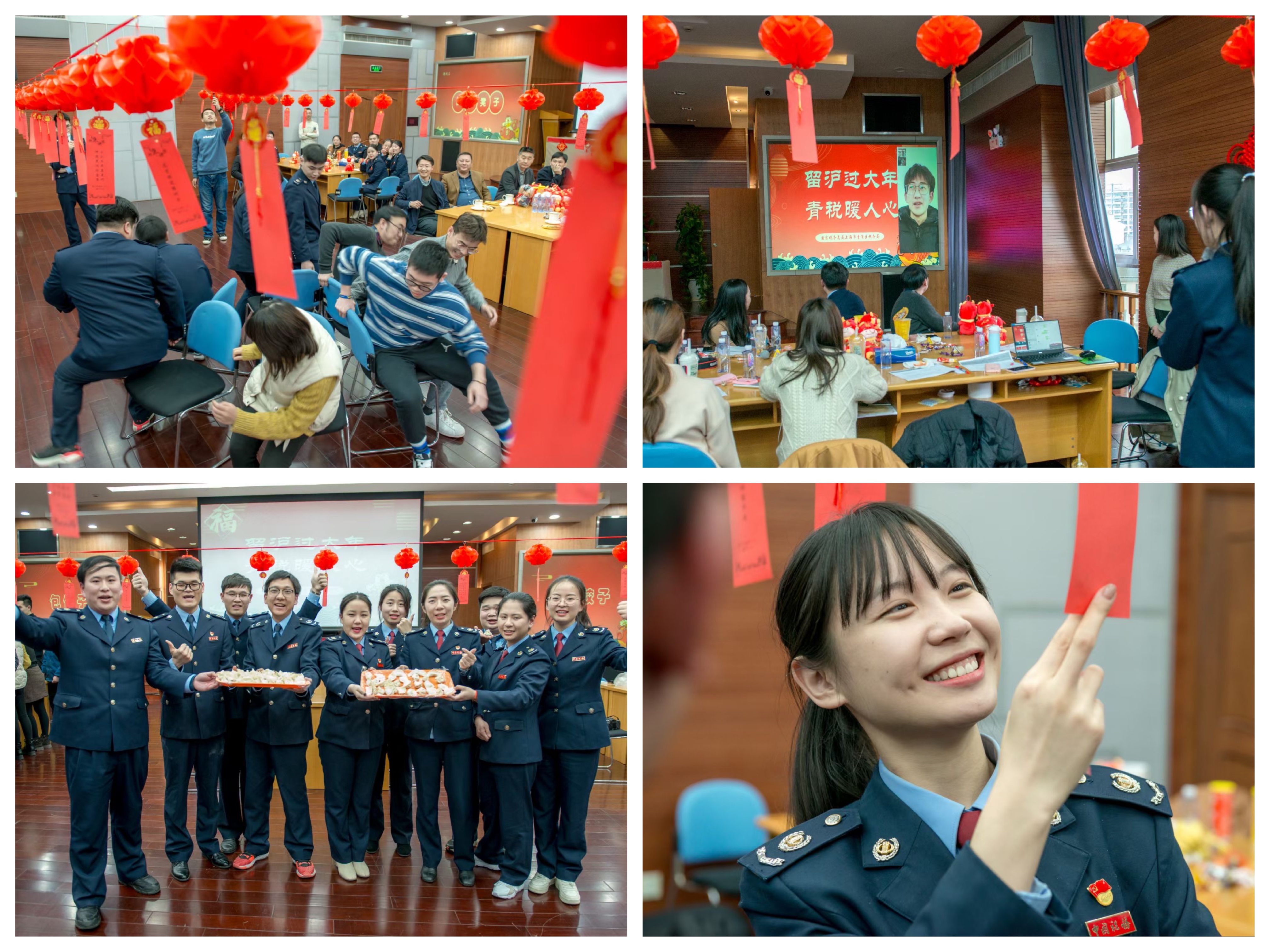 心安即归处,他乡亦团圆。在小年夜,区局组织开展“留沪过大年青税暖人心”关怀非沪籍青年活动。“听歌识曲、你比我猜、快夹好运球……”精彩纷呈的互动游戏,考验脑力的猜灯谜,各显神通的包饺子,伴随着大家的欢声笑语,这一年的辛苦忙碌成为过往。来自山东的第一税务所青年王阳猜出灯谜后,开心地说:“第一年工作就离开父母独自过年,原本觉得有点孤单,但现在疫情防控形势依然严峻,我想对我们而言最好的选择是留下。也是没料到单位为我们在假期中间准备了很多有意义的活动,心里热乎乎的。”