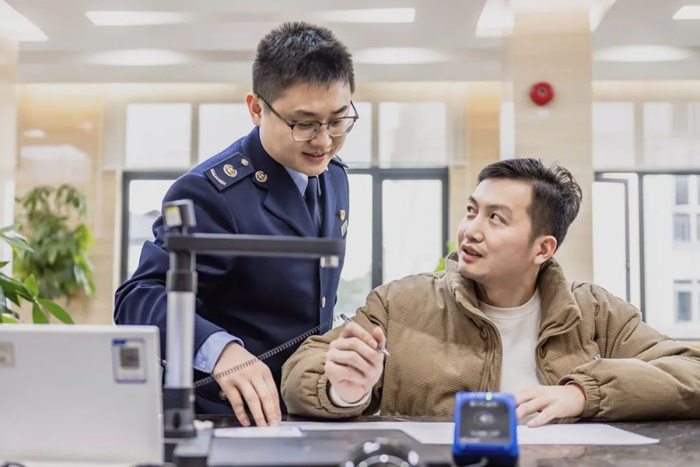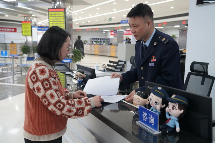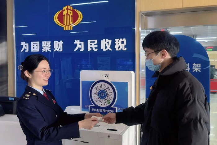 嘉定区税务局办税服务厅在蛇年开工首日迎来第一位前来办税的纳税人,导税台税务干部以饱满的干劲热情与崭新的精神面貌投入工作,为纳税人提供细致的办税指引,优化纳税人办税体验。