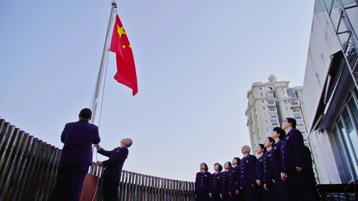 第三稽查局举行庄严的升国旗仪式。在雄壮的国歌声中,税务干部们注视着五星红旗冉冉升起,祝福祖国时和岁丰、繁荣昌盛,并表示将一如既往地勠力奋进、实干争先,在新的一年推动各项工作开新局、启新篇。