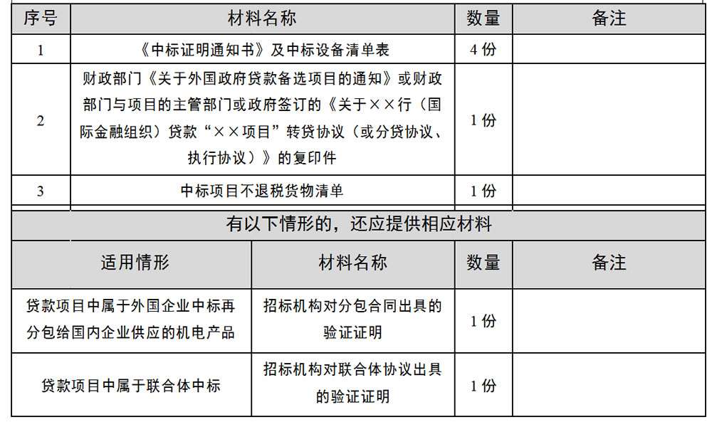 利用外国政府贷款或国际金融组织贷款建设的项目,招标机构需在中标企业签订的供货合同生效后,向其所在地主管税务机关申请办理《中标证明通知书》。《中标证明通知书》是中标企业主管税务机关对中标企业销售中标机电产品申请退(免)税业务的审核内容之一。不属于规定范围的贷款机构和中标机电产品,不予办理。