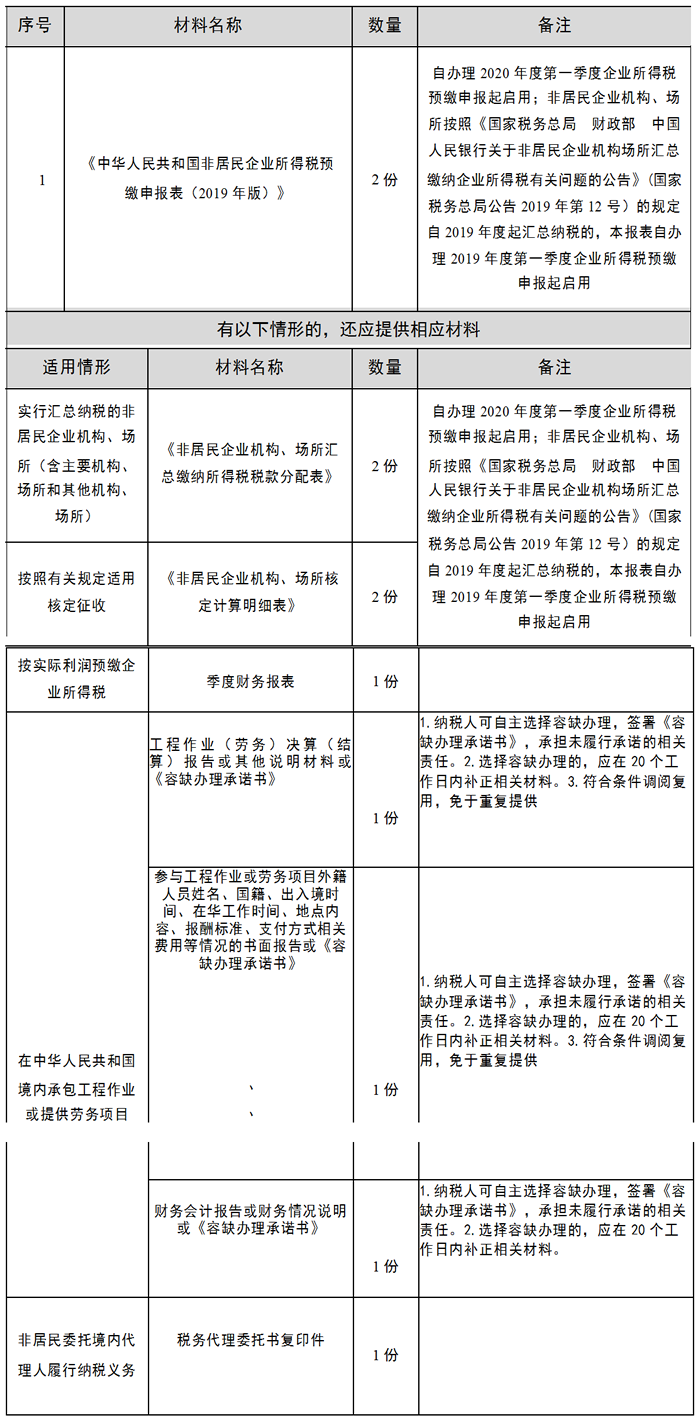 11.《中华人民共和国非居民企业所得税预缴申报表(2019 年版)》启用前,按规定使用《中华人民共和国非居民企业所得税季度和年度纳税申报表(适用于核定征收企业)/(不构成常设机构和国际运输免税申报)》或《中华人民共和国非居民企业所得税季度纳税申报表(适用于据实申报企业)》。