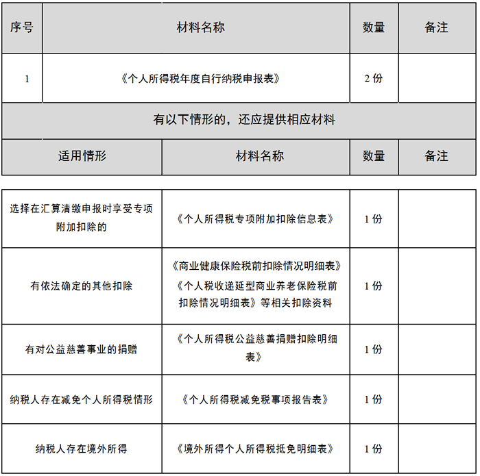 月 居民个人取得工资、薪金所得、劳务报酬所得、稿酬所得、特许权使用费所得等综合所得且符合下列情形之一的纳税人,在取得所得的次年 3 月 1 日至 630 日内填报《个人所得税年度自行纳税申报表》及其他相关资料,办理年度汇算或者随年度汇算一并办理纳税申报: