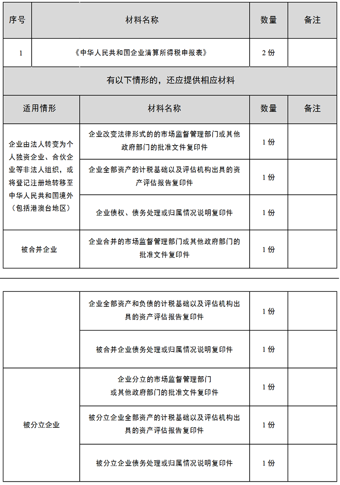 因解散、破产、重组等原因终止生产经营活动的纳税人,不再持续经营的纳税人,企业由法人转变为个人独资企业、合伙企业等非法人组织,或将登记注册地转移至中华人民共和国境外(包括港澳台地区),在办理注销登记前,以整个清算期间作为一个纳税年度,依法计算清算所得及其应纳所得税,自清算结束之日起 15 日内,填报《中华人民共和国企业清算所得税申报表》及其他相关资料,向税务机关进行申报。