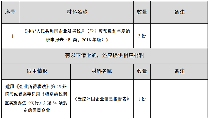 按照企业所得税核定征收办法缴纳企业所得税的居民企业年度终了之日起5 个月内或在年度中间终止经营活动的自实际终止经营之日起 60 日内,依照税收法律、法规、规章及其他有关企业所得税的规定,向税务机关填报《中华人民共和国企业所得税月(季)度预缴和年度纳税申报表(B 类,2018 年版)》及其他相关资料,向税务机关进行企业所得税年度申报。实行核定定额征收企业所得税的纳税人,不进行汇算清缴。