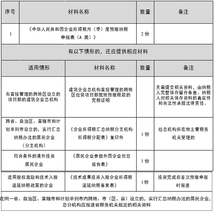 实行查账征收方式申报企业所得税的居民企业(包括境外注册中资控股居民企业)在月份或者季度终了之日起的 15 日内,依照税收法律、法规、规章及其他有关规定,向税务机关填报《中华人民共和国企业所得税月(季)度预缴纳税申报表(A 类)》及其他相关资料,进行月(季)度预缴纳税申报。
