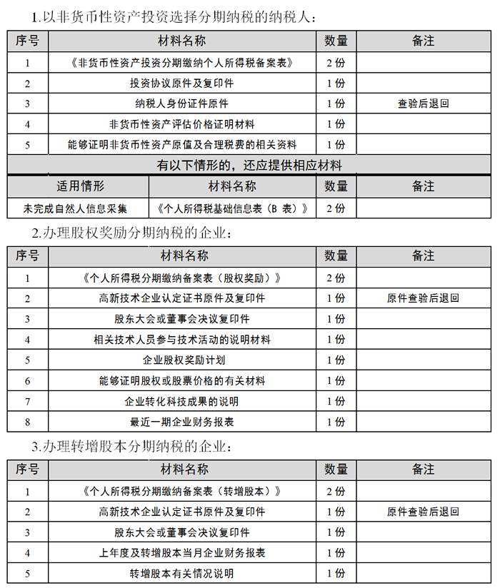 3.高新技术企业转化科技成果,给予本企业相关技术人员的股权奖励,个人一次缴纳税款有困难的,可自行制定分期缴税计划,由企业向主管税务机关办理报告备案,在不超过 5 个公历年度内(含)分期缴纳。