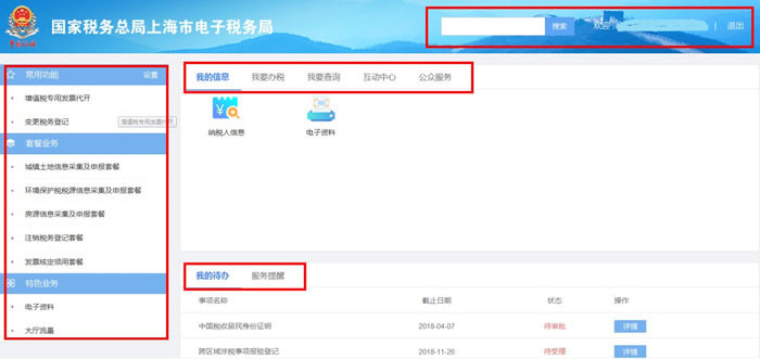 主页左部分为个性化办税的事项,包括常用功能、套餐业务、特色业务与我的收藏。【常用功能】根据纳税人办理频次显示。【套餐业务】包含发票核定领用套餐、跨区域涉税事项综合办理等套餐业务。【特色业务】目前包含电子资料、大厅流量功能。登录后主页如下图所示: