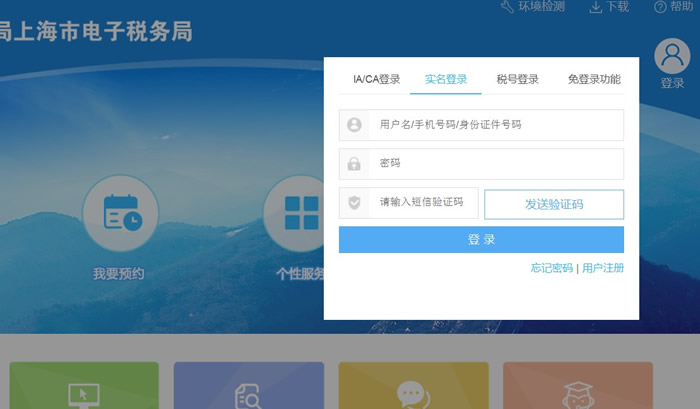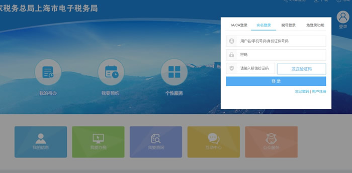 自然人用户输入用户名/手机号/身份证号、密码,点击【登录】。原上海市网上办税服务厅和上海市税务局网站的账号密码均可使用,登录后界面一致。对企业,支持CA/IA和税号登录方式。登录界面如下图所示:
