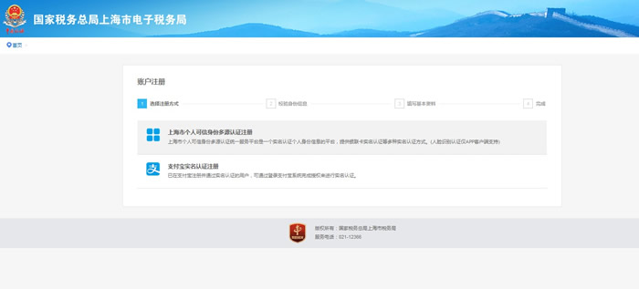 点击主界面右上方的【登录】按钮,弹出登录框,点击【用户注册】按钮,进入自然人账号注册界面,提供上海市个人可信身份多源认证注册和支付宝实名认证注册两种方式。注册界面如下图所示: