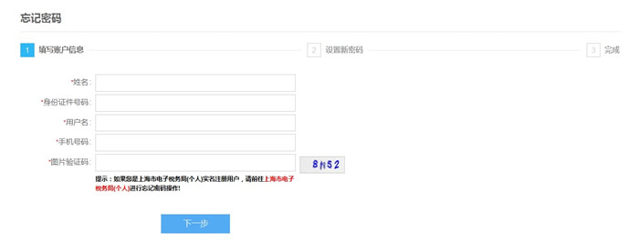 点击登录框中的【忘记密码】,进入找回密码界面,录入相应信息并验证后,完成密码重置。重置密码界面如下图所示: