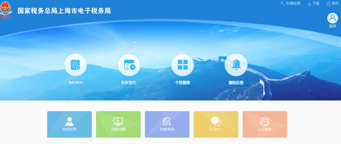 上海市电子税务局主页页头由电子税务局标识、帮助、登录等组成。点击【环境检测】可对当前的浏览器版本进行检测,判断当前环境是否满足使用要求。点击【下载】可直接跳转至下载中心,查询下载表证单书、操作指引及一些辅助软件。点击【帮助】链接至常见使用问题。点击【登录】将弹出登录框。主页内容区由我的待办、我要预约、个性服务、通知公告、我的信息、我要办税、我要查询、互动中心、公众服务组成,其中通知公告与公众服务无需登录,可直接点击进入,其他菜单需登录后进入。登录前主界面如下图所示: