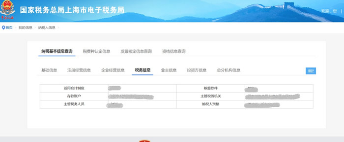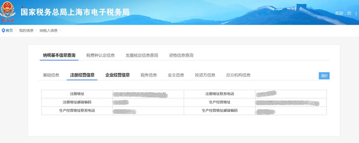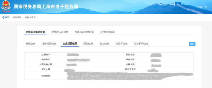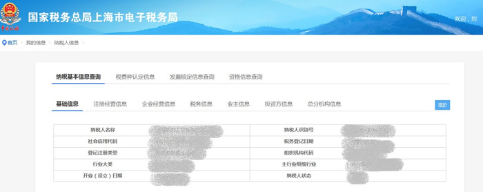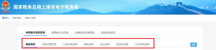 1.【纳税基本信息查询】内容为纳税人注册电子税务局的基本信息,包括基础信息、注册经营信息、企业经营信息、税务信息、业主信息、投资方信息、总分机构信息。界面如下图所示:
