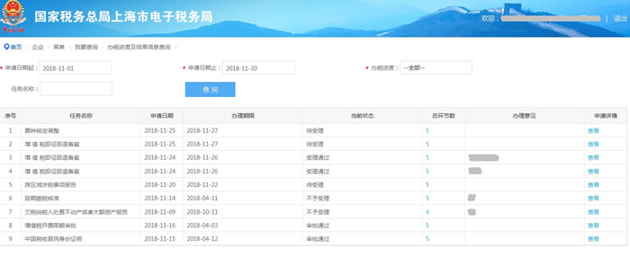 【办税进度】可查询纳税人办理涉税事项的进度、查看已申请信息、作废已提交未受理的涉税事项申请、下载打印税务端生成的各类报告、通知等文书、对已提交未受理的申请进行资料补录等。界面如下图所示:
