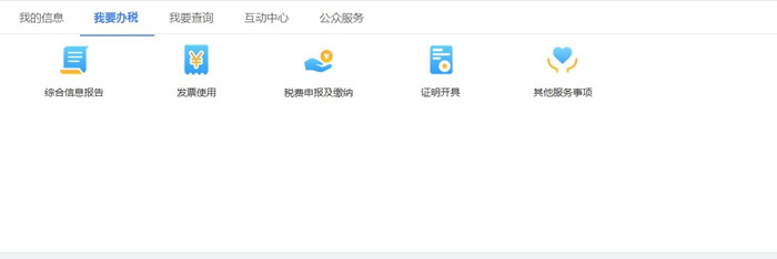中间内容区设置我的信息、我要办税、我要查询、互动中心、公众服务五大功能菜单,纳税人可通过主菜单选择进入需要办理或查询的事项。