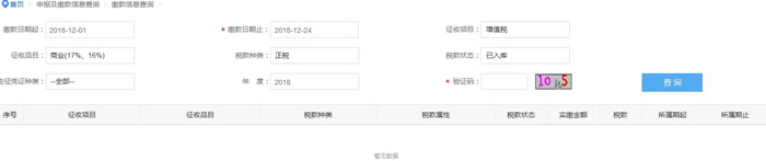 【缴款信息】可查询选定的时间段内的缴款信息。纳税人输入验证码,点击【查询】。查询界面如下图所示:
