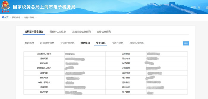 (5)业主信息内容主要为法人姓名、身份证件号、固定电话、邮箱、财务负责人姓名、身份证件号、固定电话、邮箱、办税人员姓名、身份证件号、固定电话、邮箱等个人信息,界面如下图所示: