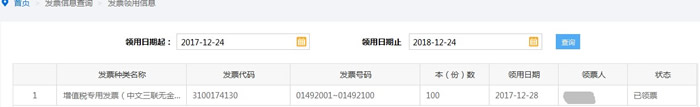 【发票信息】可查询领用的发票信息,纳税人选择发票种类跟申请日期,点击【查询】,便可查询发票信息。查询界面如下图所示: