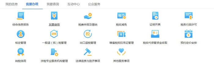 纳税人登录后主页面,点击我要办税,进入办税中心办理业务事项。实现综合信息报告、发票使用、税费申报与缴纳、税收减免、证明开具、税务行政许可、核定管理、一般退(抵)税管理、出口退税管理、增值税抵扣凭证管理、税收代保管资金收取、预约定价安排、纳税信用、涉税专业服务机构管理法律追责与救济事项和其他服务事项网上办理(详见附件2)。
