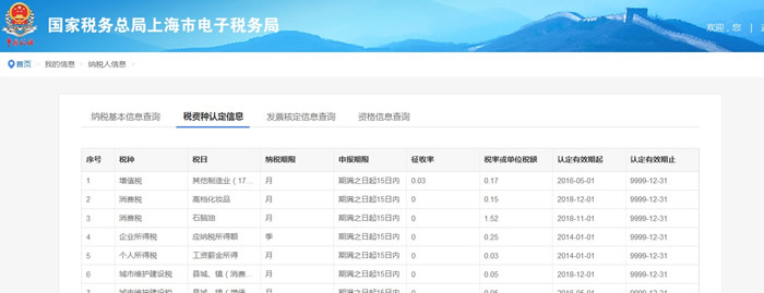 纳税人信息包括纳税人基本信息查询、税(费)种认定信息、发票核定信息查询、资格信息查询。界面如下图所示: