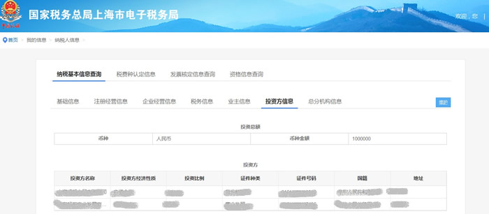 (6)投资方信息内容主要为投资总额、投资方名称、投资方经济性质、投资比例、证件种类、证件号码、国籍、地址,界面如下图所示: