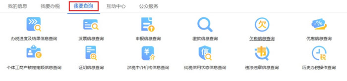 我要查询基本为纳税人的自我查询,可对纳税人的办税进度、定额核定、申报信息、缴款信息、信用状态、违法违规、优惠信息、证明信息、欠税信息等信息进行查询。界面如下图所示: