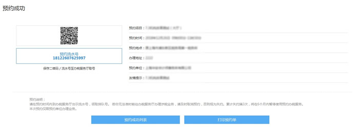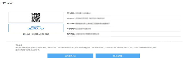1.【通办预约】为纳税人提供办理全市通办业务预约,纳税人选择预约的项目、区(分)局、大厅及日期,点击【预约】后显示预约详情。通办预约成功界面如下图: