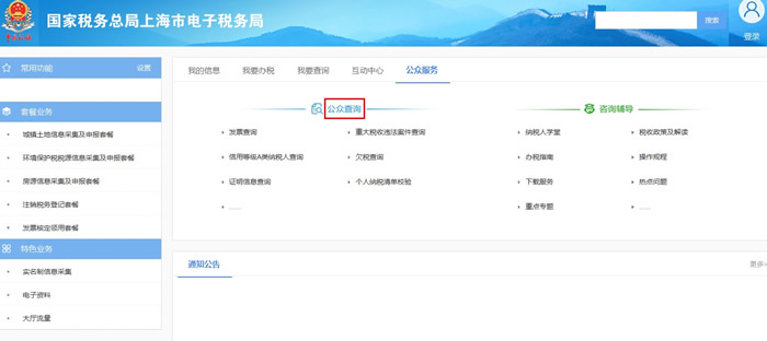 公众服务为无需登录即可查看的功能。包括公共查询、咨询辅导、通知公告。界面如下图所示: