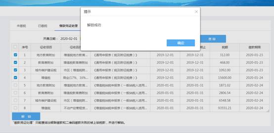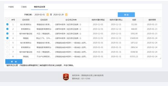 【缴税凭证处理】显示纳税人使用第三方扫码缴税或银联在线缴税失败的税款记录。勾选税票后,点击【解锁】即可作废被锁定的税票,纳税人可重新选择其他缴款方式进行缴款。
