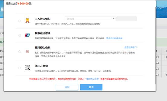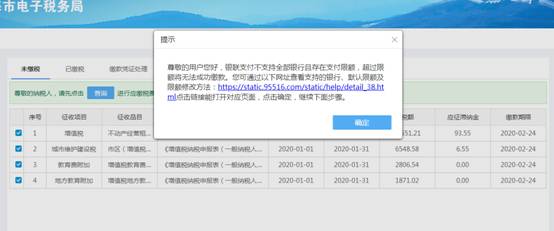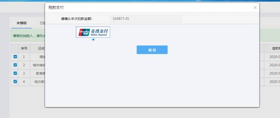 勾选待缴款记录后,选择【银联在线缴税】,弹出银联提示信息。注意,使用此缴款方式,需提前安装银联控件,在页面缴税方式说明中增加提示语和银联控件下载链接。
