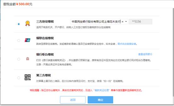 勾选待缴款记录后,选择【三方协议缴税】,选择已签订成功的三方协议信息,包括银行名称、银行卡号(展示末尾4位数字)。
