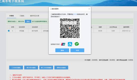 税款缴纳页面包括【未缴税】【已缴税】【缴款凭证处理】三个tab页。点击“去缴税”展示缴税方式,缴款方式包括【三方协议缴税】【银联在线缴税】【银联柜台缴税】【第三方缴税】,四种方式一次只能选一种。
