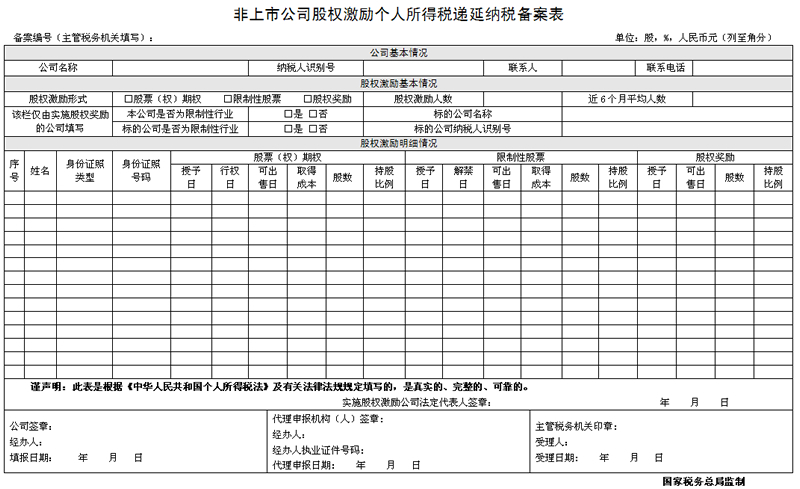 本表适用于实施符合条件股权激励的非上市公司向主管税务机关办理个人所得税递延缴纳备案事宜时填报。