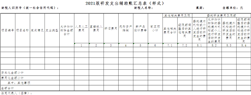 (一)本表根据所属期间的费用化、已结束的资本化项目的《2021版研发支出辅助账》中项目编号、项目名称、完成情况、支出类型等表头信息和“合计金额”行的相应栏次金额填写、计算。