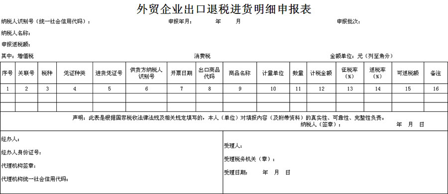 17.第15栏“可退税额”:税种为增值税的,按计税金额*退税率计算填写;税种为消费税的,从价定率方式征税的按计税金额*退税率计算填写,从量定额征税的按数量*退税率计算填写。