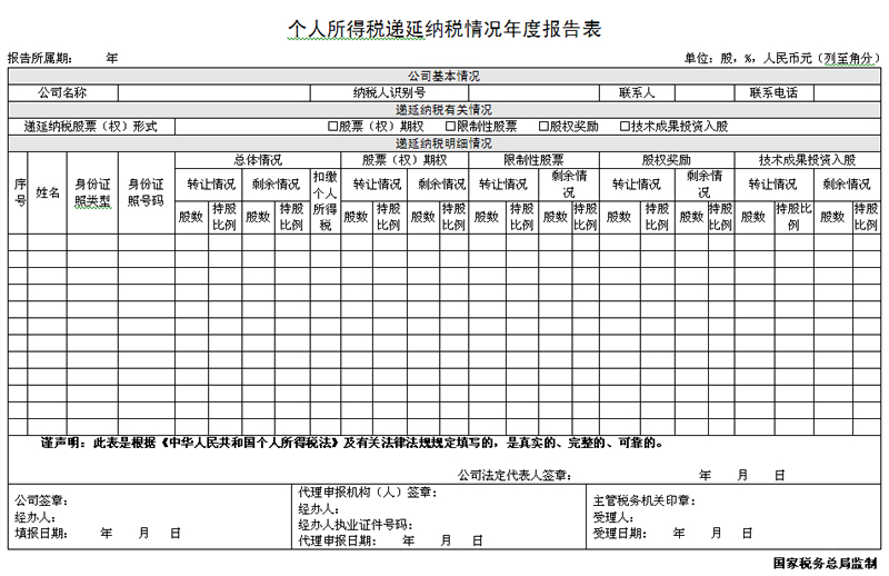 本表适用于实施符合条件股权激励的非上市公司和取得个人技术成果的境内公司,在递延纳税期间向主管税务机关报告个人相关股权持有和转让情况。