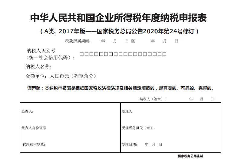 中华人民共和国企业所得税年度纳税申报表(A类, 2017年版——国家税务总局公告2020年第24号修订)