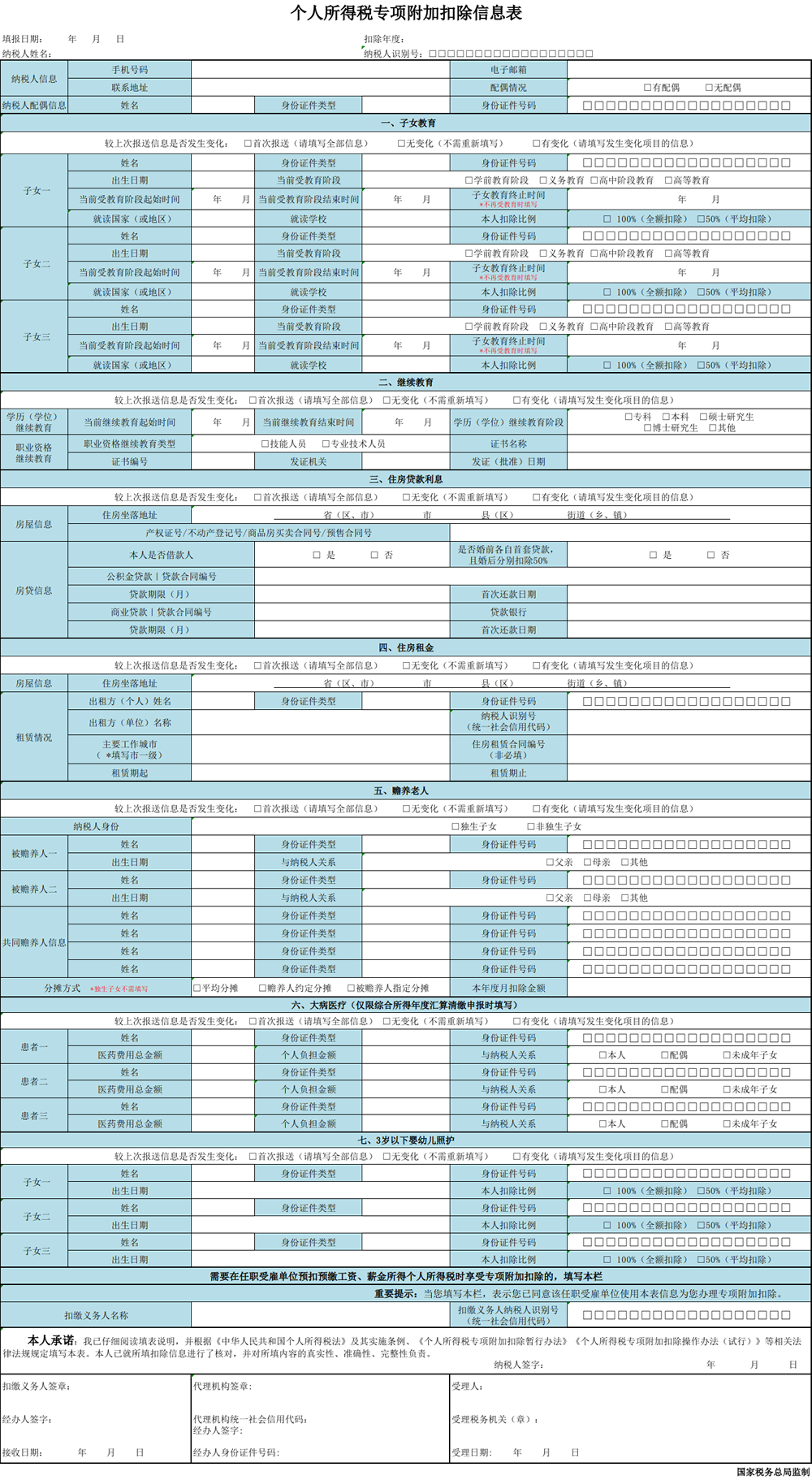 (二)纳税人首次填报专项附加扣除信息时,应将本人所涉及的专项附加扣除信息表内各信息项填写完整。纳税人相关信息发生变化的,应及时更新此表相关信息项,并报送至扣缴义务人或税务机关。