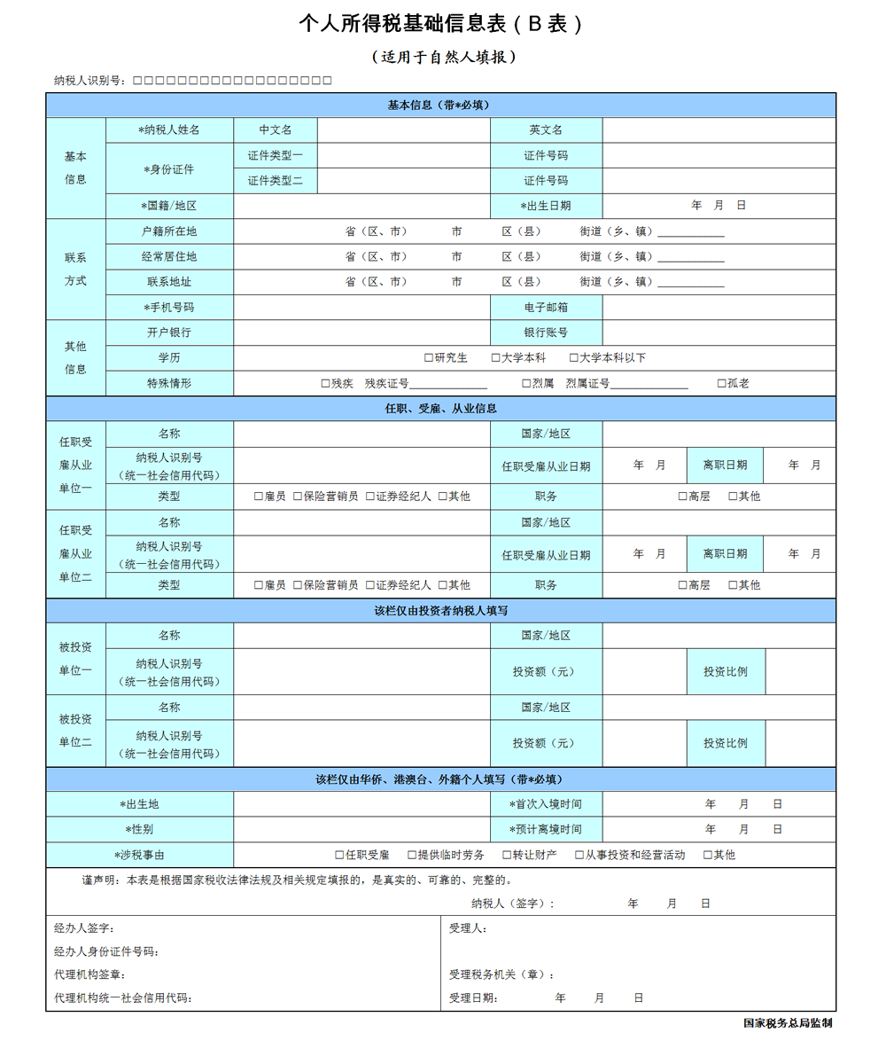 自然人纳税人初次向税务机关办理相关涉税事宜时填报本表;初次申报后,以后仅需在信息发生变化时填报。