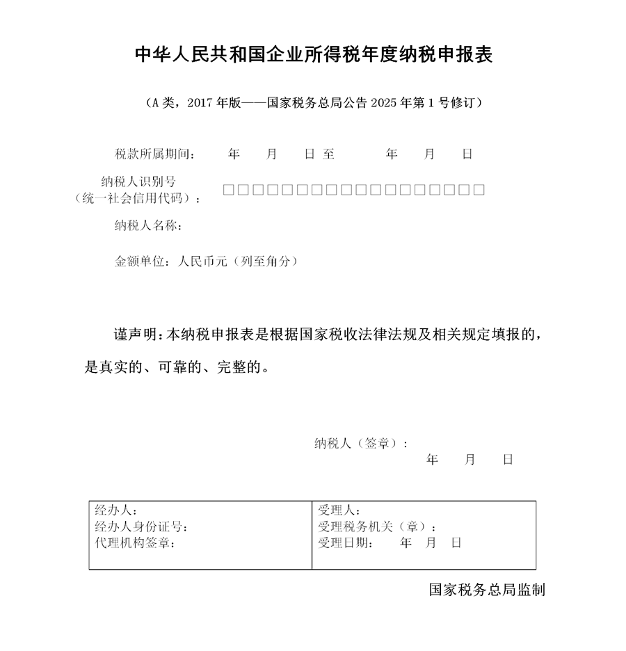 中华人民共和国企业所得税年度纳税申报表(A类, 2017年版——国家税务总局公告2025年第1号修订)