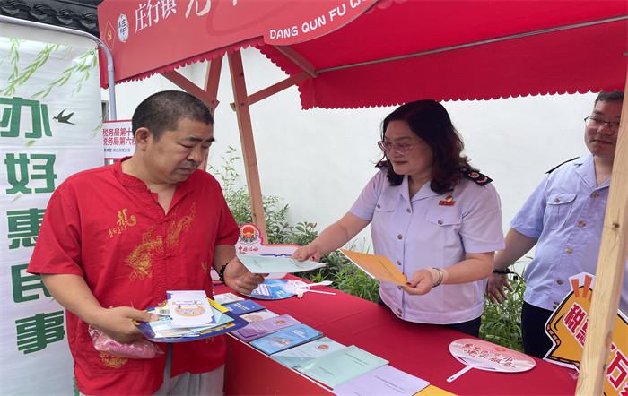 在庄行镇,区局第十六税务所主动加入党群服务集市,在集市内开展税收宣传,以“摆摊”的形式吸引企业和群众“赶集”。摊位上,各类税惠政策宣传册内容简洁明了,干货满满,成为集市上的焦点。“您可以微信关注上海税务公众号,点击办税缴费,选择社保缴费,按操作提示输入信息,就可以足不出户缴费了,还可以把家人的都一起缴了。”“您的子女在创业的话,可以了解这个支持重点群体创业就业的政策。”不少市民驻足税务摊位前,对税收宣传给予了肯定。